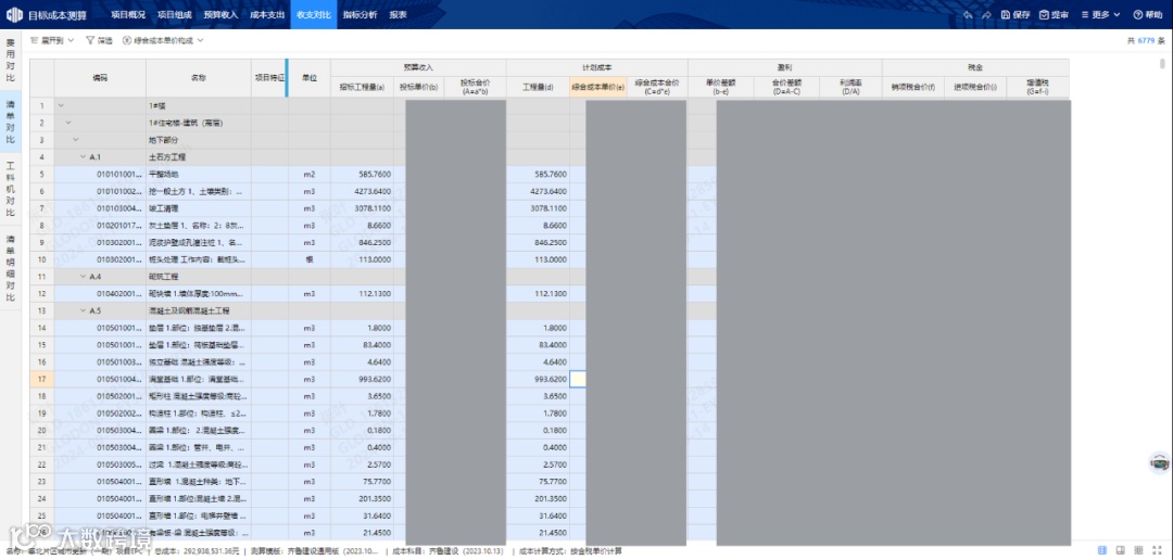 以往,山东齐鲁公司成本管理聚焦于总体利润分析,缺乏精细化的成本洞察。然而,随着管理理念的不断升级与数字化工具的广泛应用,公司开始积极探索更为精细、科学的成本管理方式。以某产业园项目为例,中标后进入目标责任成本编制阶段,结合数字新成本平台采用新做法,将项目完整的科目收入纳入分析体系,并与以往粗放式管理进行对比,发现具体的成本优化项,且可按照清单进行成本管理。通过收支对比分析,清晰地看到主体队伍脚手架及模板工程属于亏损项。经过成本预算部与项目经理沟通,锁定优化金额逾百万。