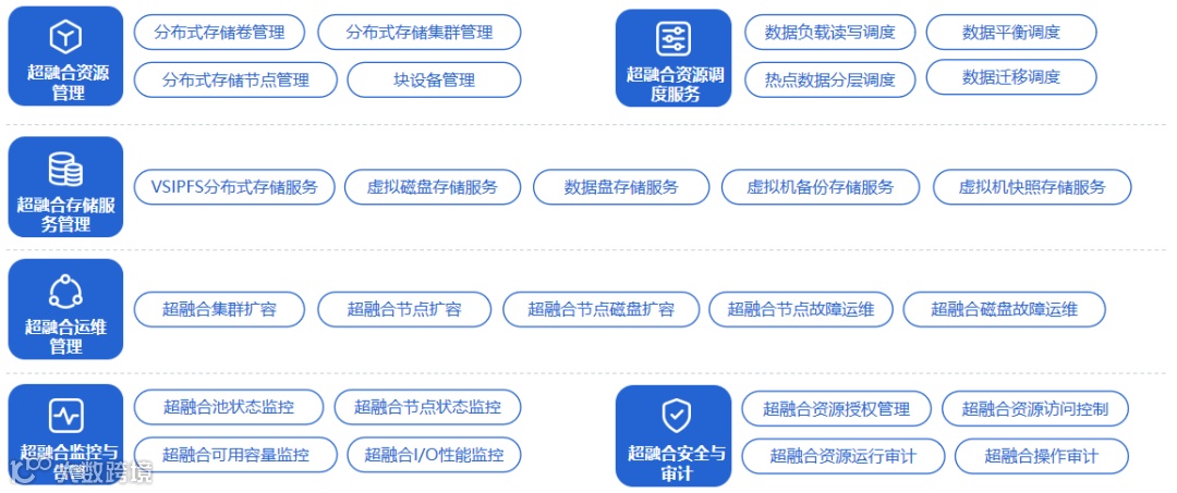 海誉云™ CloudBasis VSIP-HCI超融合基础架构系统将自主VSIPFS超融合分布式存储与计算虚拟化、网络虚拟化功能集成到单一宿主服务器节点和资源池,兼具VSIP虚拟化基础架构系统的资源统一管理、资源调度管理、存储服务管理、网络服务管理、高可用管理、服务管理、运维管理、监控与告警管理、安全与审计管理等核心功能,同时具备以下超融合基础架构相关核心功能。