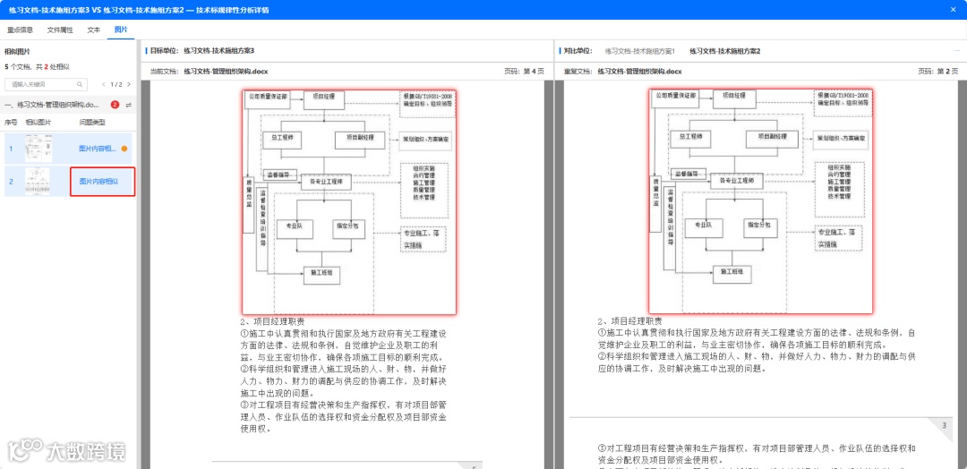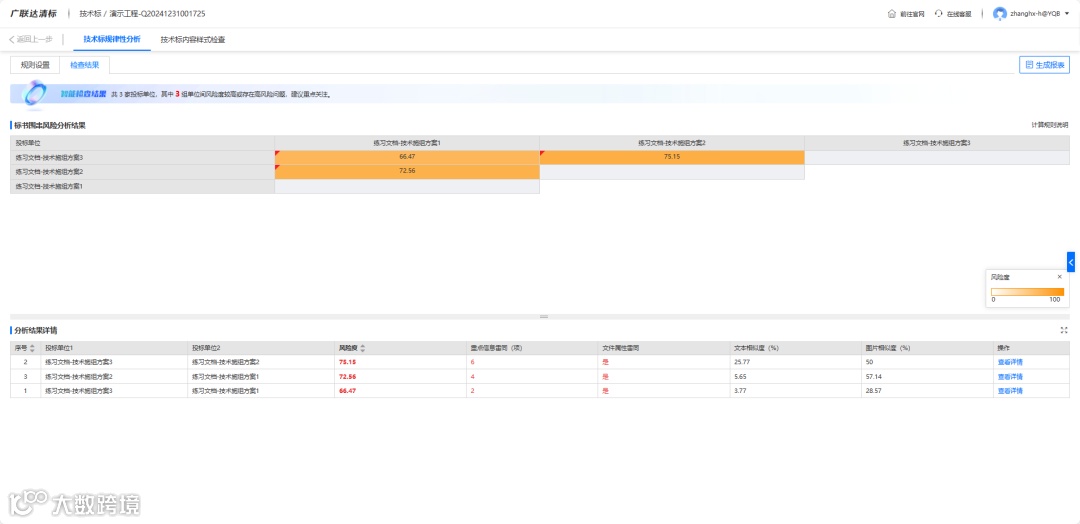 ● 文本、图片、编制者信息跨方案对比,相似度AI预警,识别潜在相似内容,智能标书围串风险分析,根据检查结果进行智能围串风险分析并给出依据,规避“疑似围标”误判风险,中标更安心。