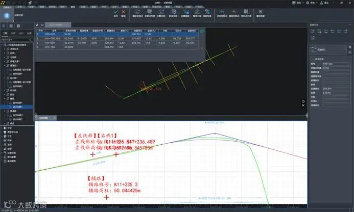 应用点1:道路采用三维交互平纵设计,纵断面动态拉坡,路网相交道路高程数据实时查看,达到精细化、高效的设计。