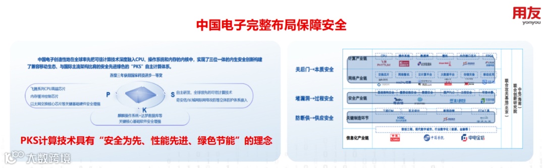 基于对数字化和信创化的深入思考,中国电子正在加速打造国家网信产业核心力量和组织平台,如今已经构建起被称为“PKS”的完整国产安全数字底座(“P”代表飞腾CPU,“K”代表麒麟操作系统,“S”代表立体防护安全链),在国产计算产业链、安全产业链、关键制造环节都有相应的布局,为国家实现关后门、堵漏洞、防断供的安全战略,提供有力支持。