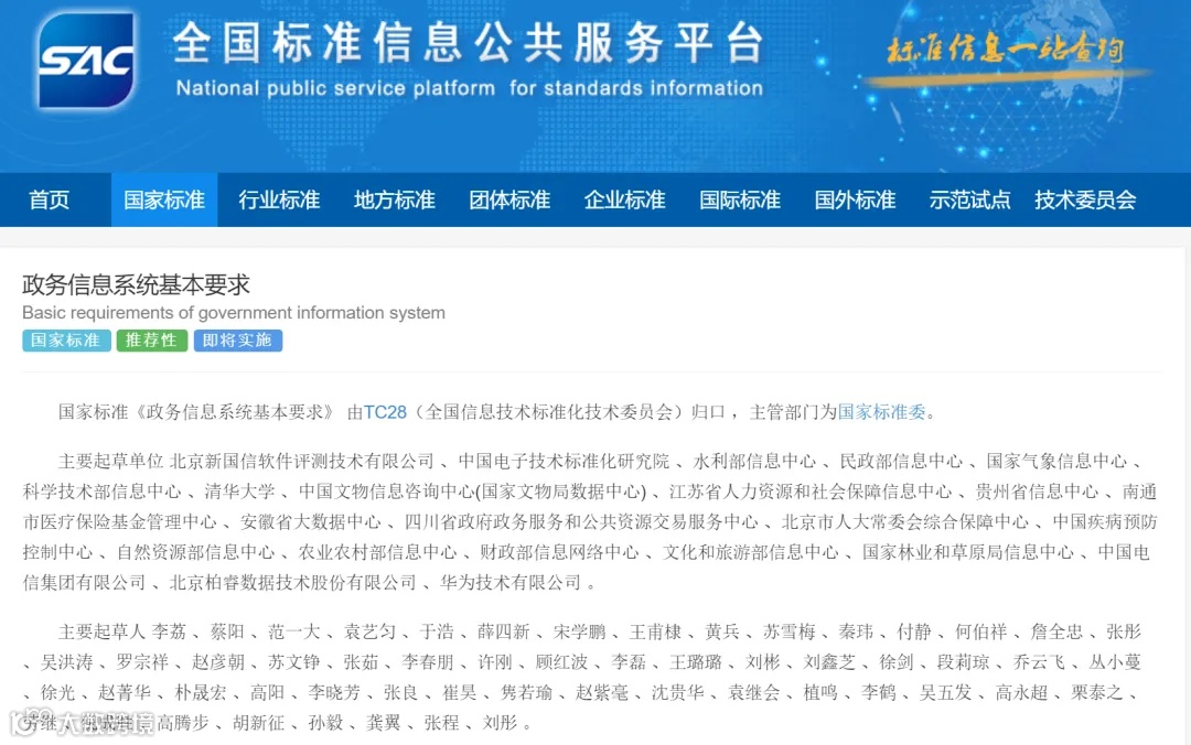 2024年8月23日,国家市场监督管理总局、国家标准化管理委员会发布2024年第17号国家标准公告,批准发布GB/T 44230-2024《政务信息系统基本要求》等多项国家标准。《政务信息系统基本要求》由国家信息中心所属的北京新国信软件评测技术有限公司(国家电子政务系统质量检验检测中心,简称“国信评测”)牵头组织编制,将于2025年3月1日正式实施。
