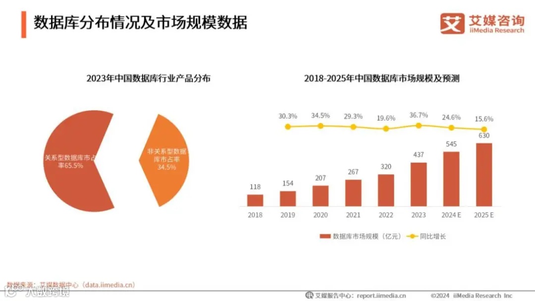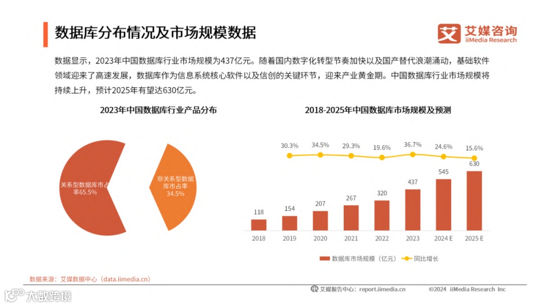 2023年中国数据库行业市场规模为437亿元。随着国内数字化转型节奏加快以及国产替代浪潮涌动,基础软件领域迎来了高速发展,数据库作为信息系统核心软件以及信创的关键环节,迎来产业黄金期。中国数据库行业市场规模将持续上升,预计2025年有望达630亿元。