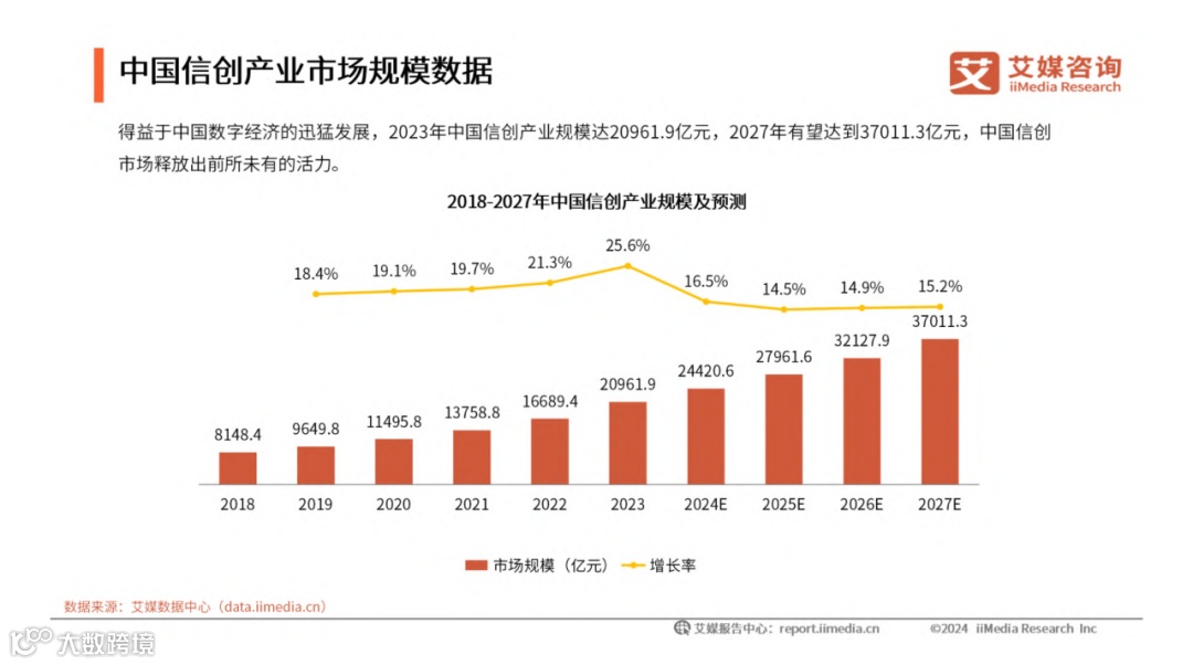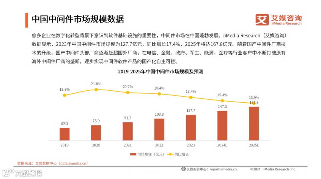 2023年中国中间件市场规模为127.7亿元,同比增长17.4%,预计2025年将达167.8亿元。随着国产中间件厂商技术的升级,国产中间件头部厂商逐渐赶超国外厂商,在电信、金融、政府、军工、能源、医疗等行业客户中不断打破原有海外中间件厂商的垄断,逐步实现中间件软件产品的国产化自主可控。