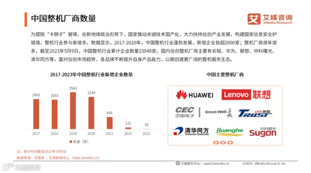 2017—2020年,中国整机行业蓬勃发展,新增企业皆超2000家;整机厂商逐年增多,截至2023年5月9日,中国整机行业累计企业数量23948家。典型企业有长城、华为、联想、中科曙光、清华同方。
