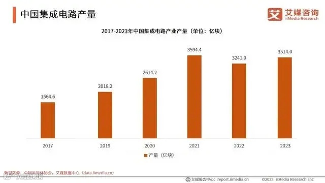 据国家统计局公布的数据显示,2023年我国集成电路产量3514亿块,同比增长6.9%,其中包括逻辑芯片、存储芯片、模拟芯片和专用芯片,以及传感器和芯片模块。