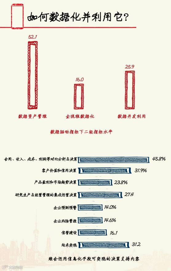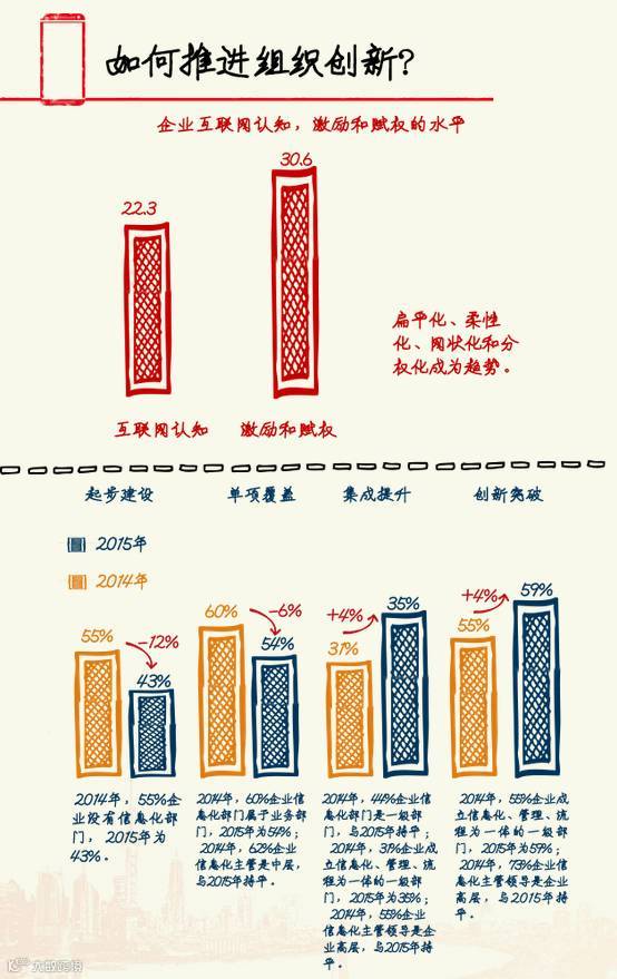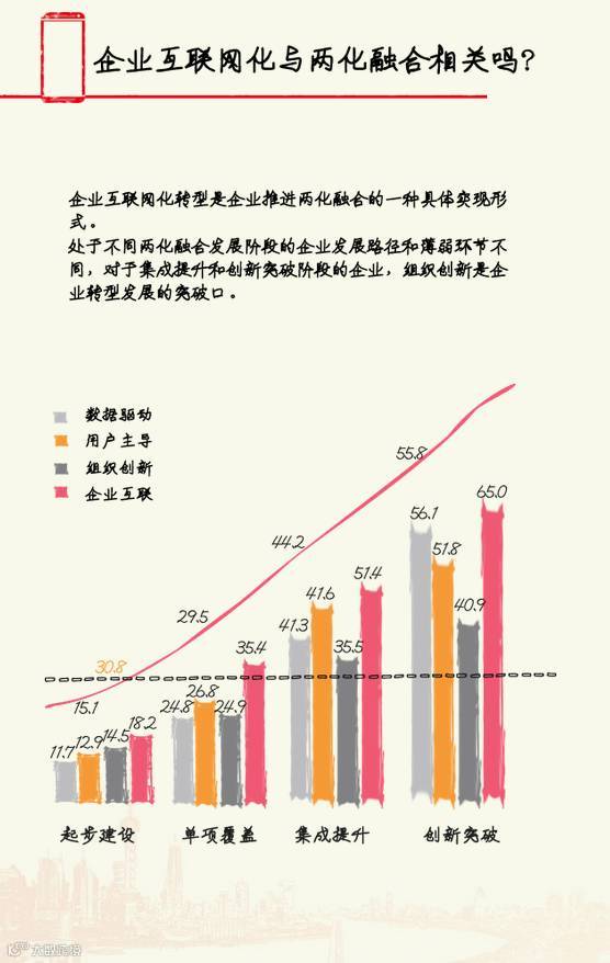 但在企业领域,与发达国家还有很大差距。2016年1月16日,由中国两化融合服务联盟携手用友网络科技股份有限公司、工信部电子科技情报所共同研究与发布了《企业互联网化指数》白皮书。调研数据显示,我国企业互联网化转型尚处起步期,2015年中国企业互联网化指数为30.8,发展水平不平衡,从地区看是东高西低,从行业看是消费品行业相对较高,从规模看是大型企业互联网化水平明显领先于小微企业,而且企业互联网化水平高低与其两化融合发展阶段与水平相关。