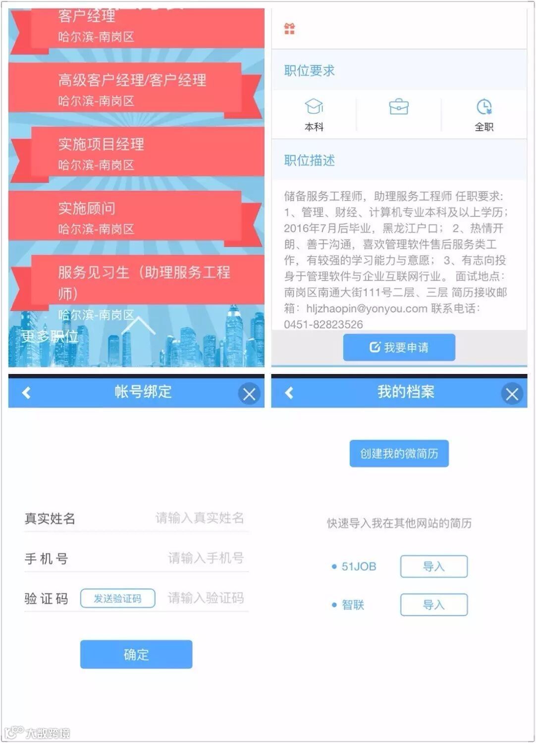 2)登陆智联招聘或前程无忧,搜索用友网络科技股份有限公司黑龙江分公司相应岗位投递简历;