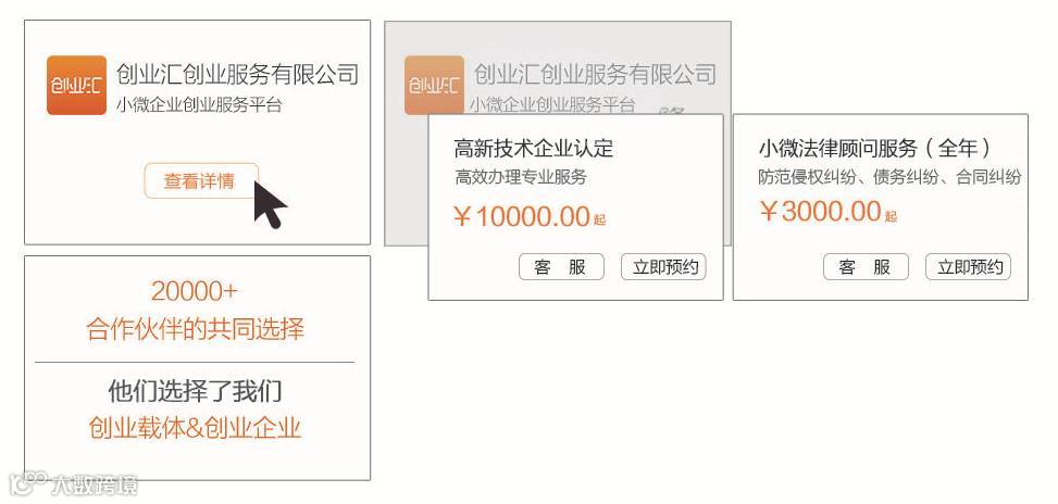 • 服务汇——创业企业选择服务产品后,根据位置、价格、评级等条件选定服务机构,在线预约服务。 服务机构能实时收到消息提醒,并在线上回复。