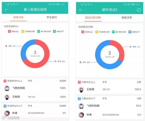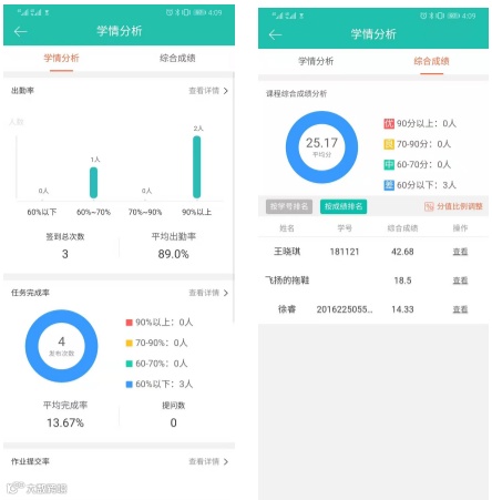 您可以查看学生出勤率、任务完成率、学生分数等详细信息,为您对学生日常表现打分提供参考。