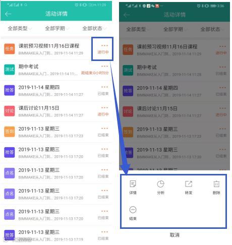 若需要查看每次教学活动的详情和分析,请点击每项活动右侧省略号,便可随时了解详细情况。