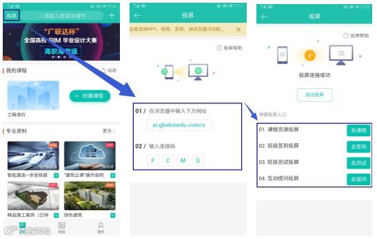 2、 连接成功后,选择相应的投屏:课程资源投屏,班级签到投屏,班级测试投屏,互动提问投屏