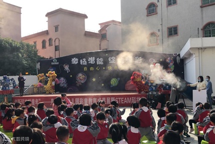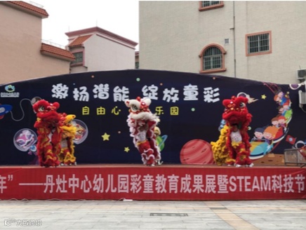 2020年12月10日至11日,由佛山丹灶中心幼儿园主办,广州孩教圈信息科技股份有限公司承办的佛山丹灶中心幼儿园彩童教育成果展暨STEAM科技节顺利举行。本次科技节以“多彩狮艺迎元旦•创新科技悦童年”为主题,这是首个将STEAM教育与狮艺相结合的科技节,既是佛山丹灶中心幼儿园进行彩童教育成果的展示,同时也是园所将狮艺文化与STEAM教育相融合的一种创新尝试,在游园活动中设置了一系列狮艺文化与STEAM教育相融合的体验专区,突出醒狮文化与STEAM教育的融合、科技创新、科普教育等内容。