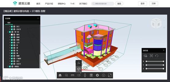 针对以上现象,在建筑云课《【精品课】建筑识图与构造》 课程中提供了 “剖切盒”的功能,该功能可以在三维模型上任意位置剖切,并查看剖切效果,这样可以实现二维图纸与三维模型直接对应的学习场景,快速增加学生的空间想象能力,减少老师的授课难度。