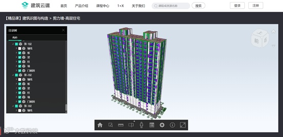 广联达建筑云课内一门全新的精品课《建筑识图与构造》可以帮上您的大忙!课程内可载入三维模型,老师与学生均可在脱锁状态下,在课前、课中、课后通过云课手机端及电脑端完成对模型的自由操作(剖面、旋转、测距、三维等),实现“所想即所见,所见即所得”的三维教学场景,加深学生对知识点的理解,从而提升教学效率!