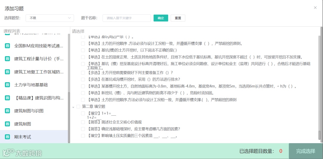 发布测试内容时,您可以自行选择习题库里的各类题型,自由进行习题类型组合。