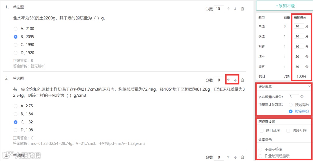 还可以对测试题目自行设置分值,包括多选题及填空题的评分规则,以及题目的删除增加、顺序修改、答案显示要求的灵活调整!