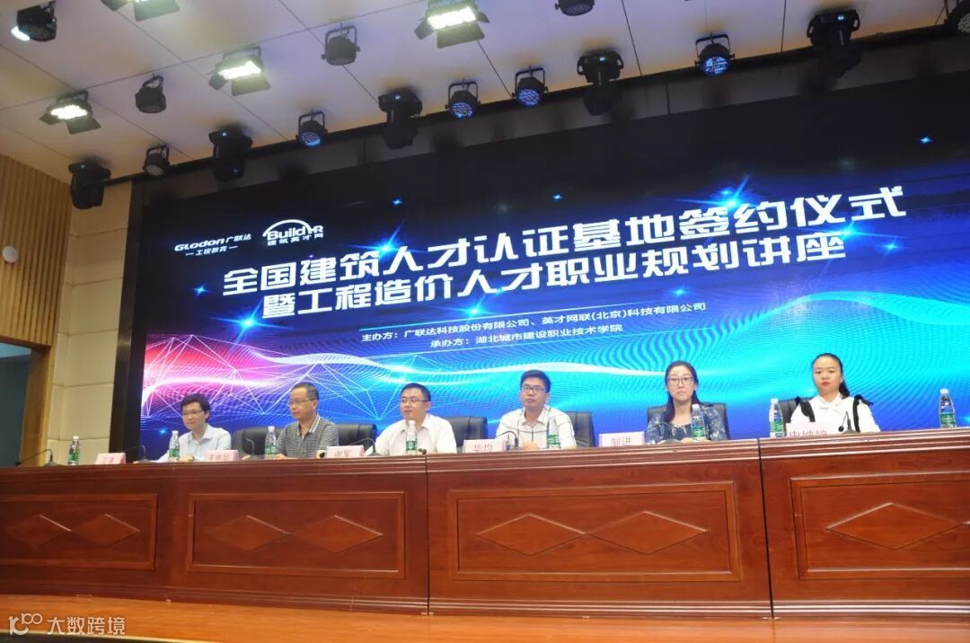 9月25号下午2点,”全国建筑人才认证基地签约仪式暨工程造价人才职业规划讲座”,在湖北城市建设职业技术学院成功举办!“认证基地”的建立,标志着广联达、建筑英才网、湖北城建学院三方,未来将在建筑人才共育上开展多方位、深入合作,将“产教融合、校企合作”政策具体落地。湖北城建学院校企合作处王佑华处长,经济管理系华均主任,广联达教育培训事业部副总经理谢军,建筑英才网市场总监王津,武汉建工集团人力资源部经理邹进、江建建设集团武汉分公司人力资源部经理史娉婷出席了本次活动,另外现场有近300名工程造价专业的学生参与了活动。