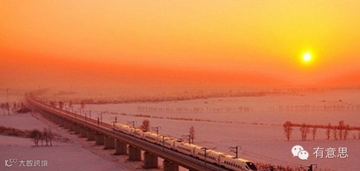 大雪纷飞,刚落地的雪片也会被飞驰的列车带起,在车身周围扬起一圈雪雾,画面朦胧,日出日落为背景,火车的色彩在白茫茫中格外醒目。