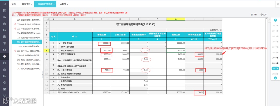 ③工会经费支出取数参考:本期余额表中(应付职工薪酬-应付工会经费(221106)这个科目的本年累计贷方发生额)=750元,纳税调整参考=工会经费支出-工资薪金支出*2%=750-30000*2%=150元,需进行纳税调增。