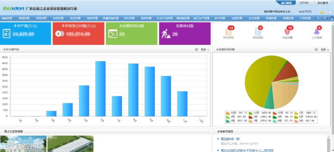此次项目管理系统的建设共搭建了17个业务模块、310个子模块,配置了39张报表,梳理了38个流程,上线4家公司、19个项目部,注册用户170人,共计产生业务单据6149张,产生审批流程532条。实现了数据及流程的标准化管理,具体体现为: