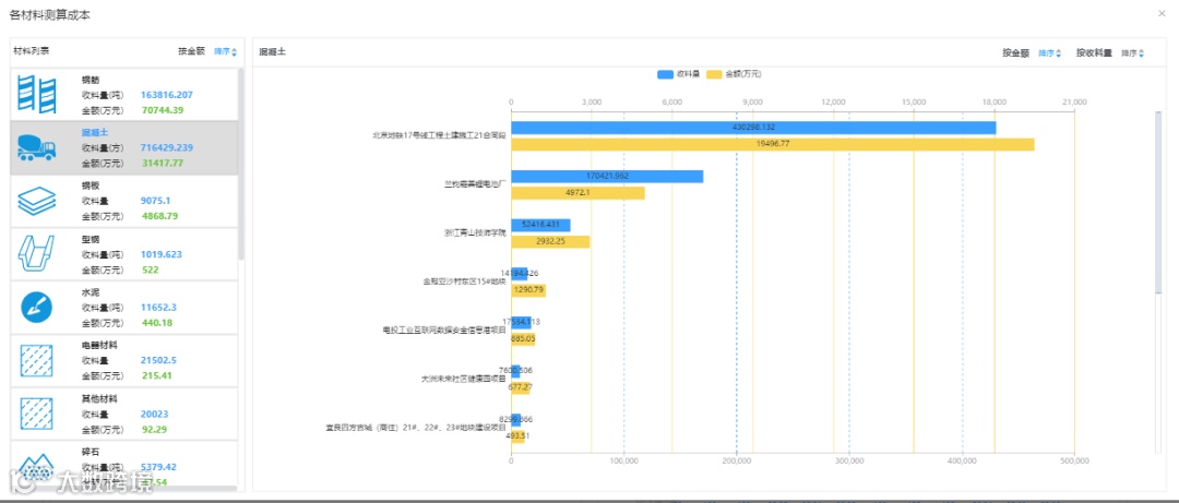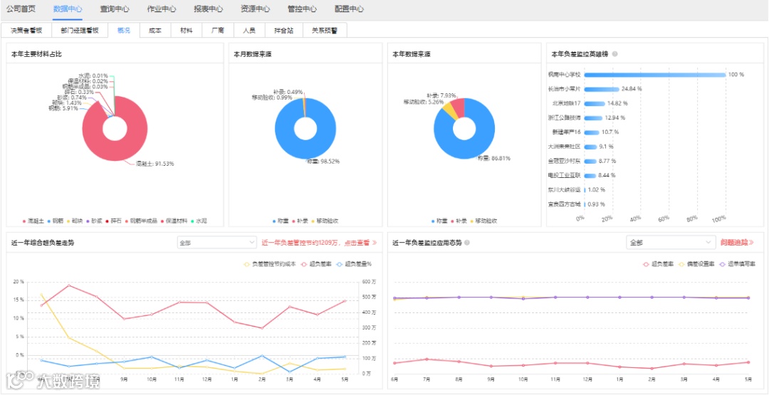 自21年起,累计收料57197次,涉及支出成本约12.14亿元,收料成本呈波动性上升状态,说明上线项目逐渐过磅规范。各材料、各项目进场量及占用资金情况清晰,重点材料供应有保障。