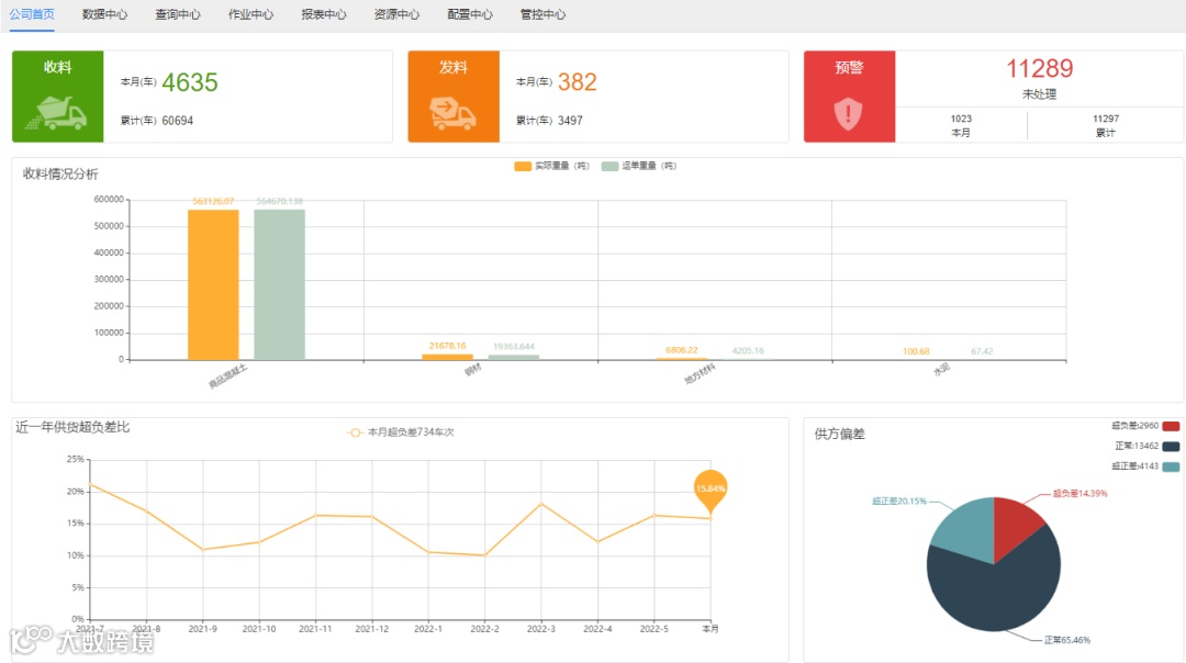 截至2022年6月25日,累计上线18个项目;累计收料过磅车次60569车次,发料3476车次,过磅量达212.2万吨,单日最高过磅车次445车次。主要过磅材料为商混、钢材、水泥、砂石料等,主要材料均纳入验收管理。86.81%采用过磅验收,5.26%使用APP移动验收,补录7.93%。其中,混凝土是最主要的验收材料,占到91.53%。