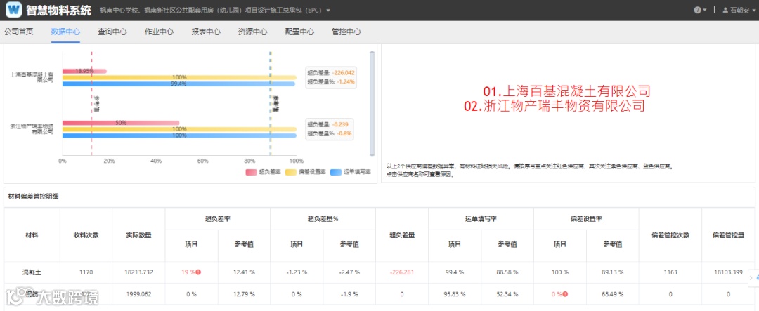 选择配合度高的重点项目,指定专人负责、统一归口,从开始做好统筹规划,并在过程中持续关注,对基础设置规范管理,及时检视纠偏。在枫南中心学校公共配套用房项目,通过系统数据规范性管理,切实促进了物资验收规范化:通过项目和公司数据互通,助力了管理落地;通过偏差管控、过程留证等功能应用让供方不敢少供料,物资供应有保障,间接促进生产;同时带来附加经济效益,即便混凝土容重比设置偏低,通过对混凝土超负差的监控挽回损失约15万元。