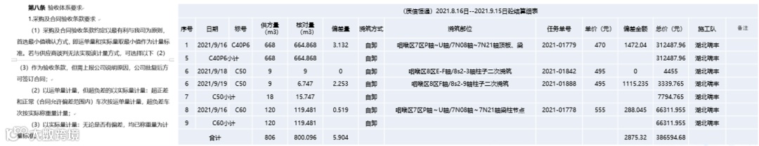 应用初期发现混凝土超负差较多,即便正常的也几乎都是接近允许的偏差下限,为了约束供应商降低偏差,公司对合同允许偏差做了统一设置,由原来的-2%调整为-1.5%,相当于混凝土管控上提升了0.5%的可能效益,并对混凝土容重比设置做了规范性要求;不仅如此,随着应用的推广,混凝土超负差还下降了4%,约束供应商越来越规范,对生产供货更有保障;公司要求按系统数据进行对账结算并每月给公司上报结算清单,通过结算清单发现有个项目仅混凝土一项1年2个月的时间就节约了413万,单月最高节约了87万。
