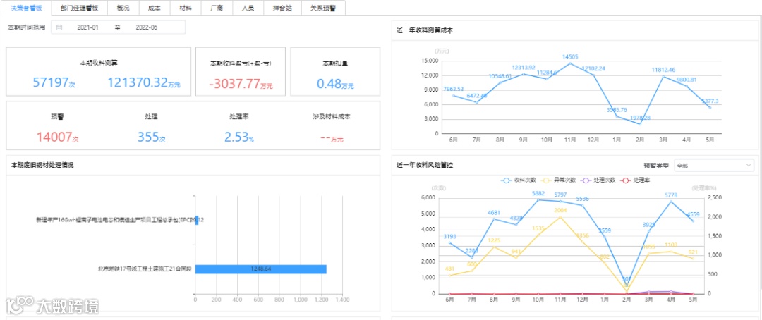 基于物资业务管理需求、成本管控需求,采集、积累并根据变化趋势分析各项目业务数据,形成部门经理看板、决策者看板。通过数据看板,一目了然掌握主要材料偏差情况,管理趋势,识别管理重点,对公司材料成本、盈亏、风险指标、管控指标快速了解,为企业管理决策提供数字依据。