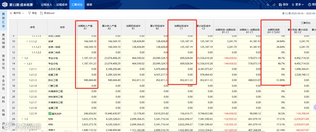现在:实现多维度(科目级、合约级、费用明细)的“三算对比”分析,自动标红亏损项,及时发现成本风险并追溯问题源头。