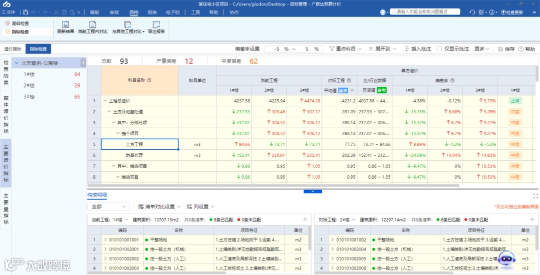 项目部的人都忙,没工夫学复杂工具。但云计价-质控-指标检查操作特别简单,很好地弥补了这一点,两步就能搞定指标计算和对比:
