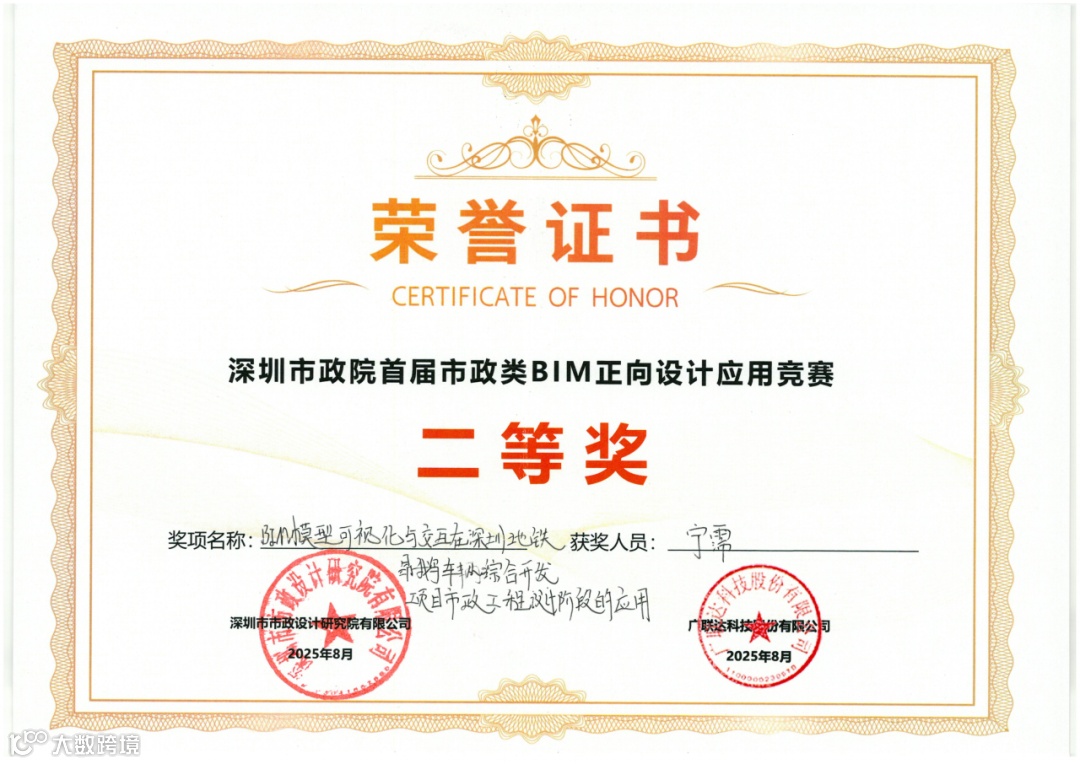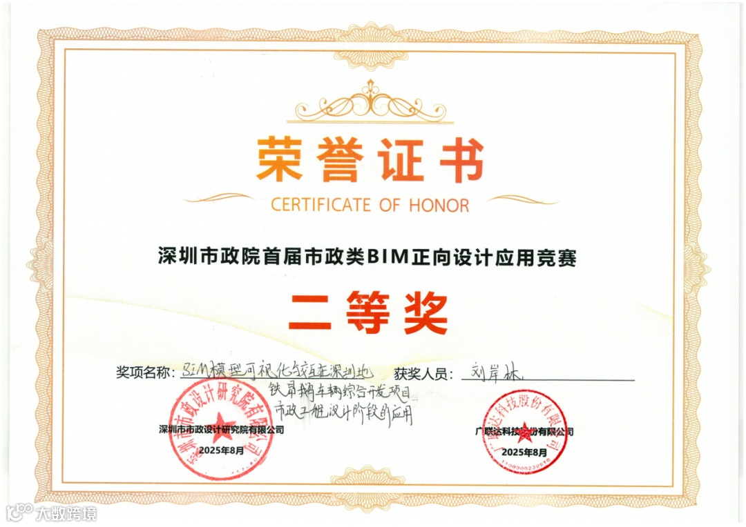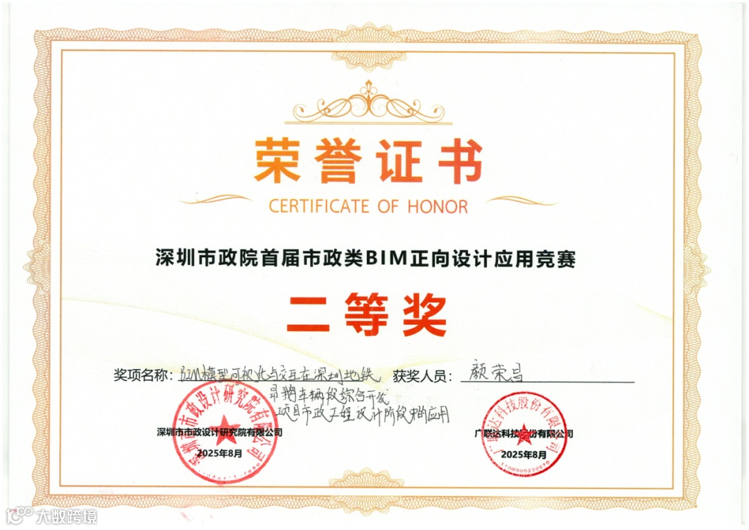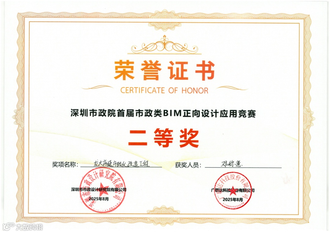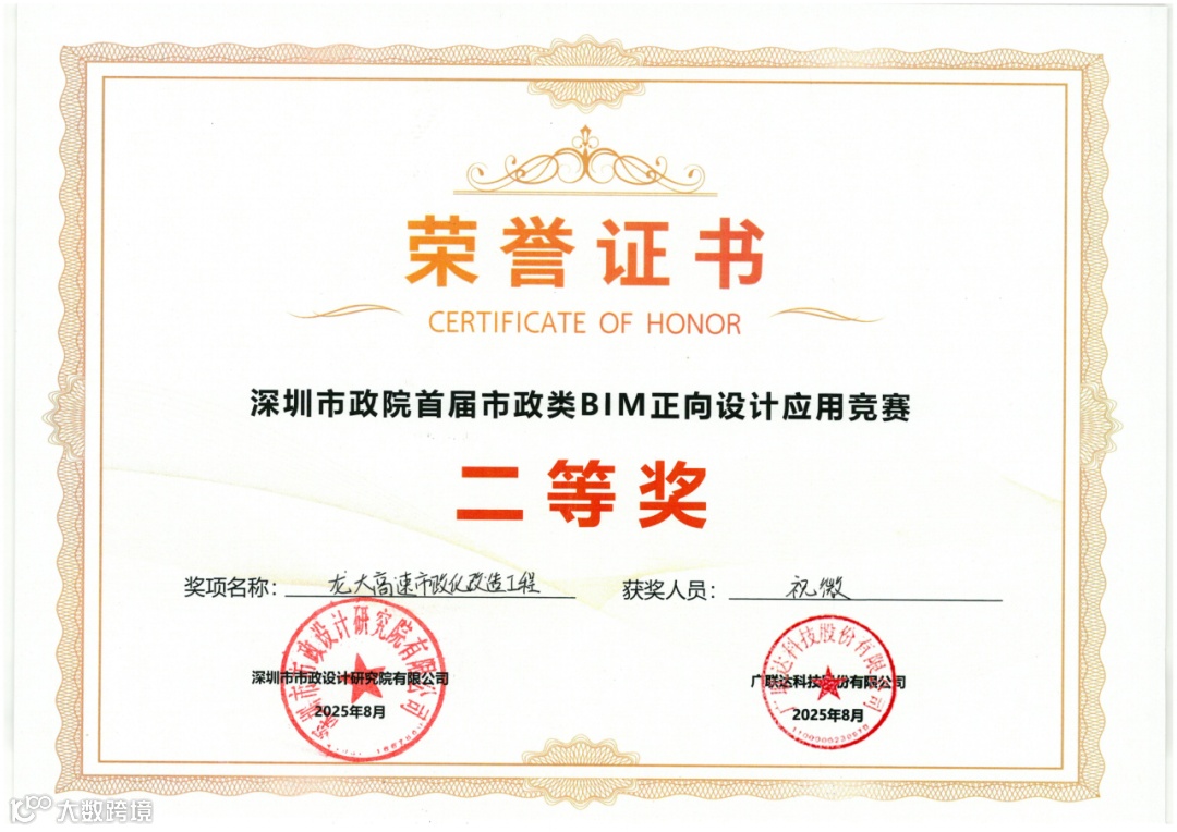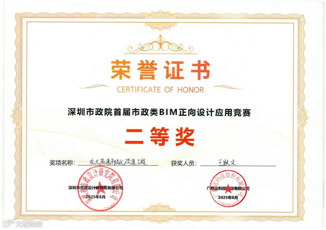 4.二等奖:《龙大高速市政化改造工程》和《BIM模型可视化与交互在深圳地铁昂鹅车辆段综合开发项目市政工程设计阶段中的应用》斩获二等奖。