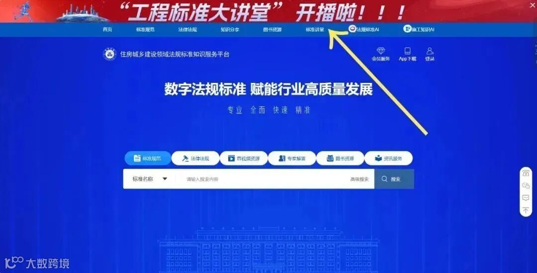 打开住房城乡建设领域法规标准知识服务平台(网址为:www.kscecs.com),点击网站首页顶部入口,即可直接进入“工程标准大讲堂”观看课程。