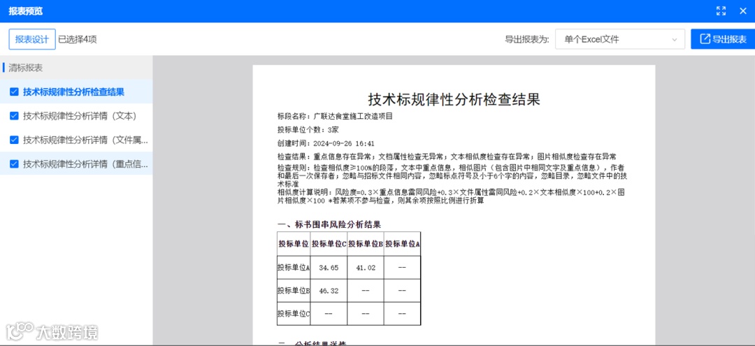 直观展示清标详情,涵盖结果汇总、符合性、计算、文档属性、规律性及合理性报价多维度分析。