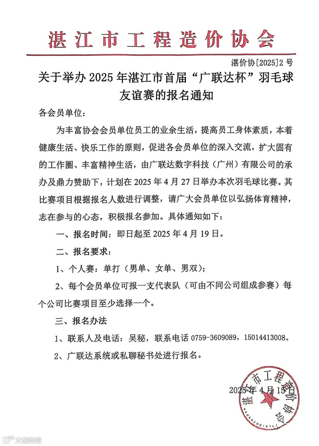 为丰富协会会员单位员工的业余生活,提高员工身体素质,本着健康生活、快乐工作的原则,促进各会员单位的深入交流,扩大固有的工作圈、丰富精神生活,由广联达数字科技(广州)有限公司的承办及鼎力赞助下,计划在2025年4月27日举办本次羽毛球比赛。其比赛项目根据报名人数进行调整,请广大会员单位以弘扬体育精神,志在参与的心态,积极报名参加。