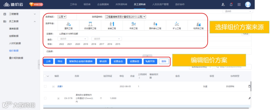 数据存储完成后,可以在造价云管理平台中对数据进行管理。造价云管理平台可以通过软件右上角,头像下方的功能点击进入,也可以在组价方案中,左边切换到员工存档数据或企业数据后,点击组价数据维护进入云端管理组价方案。