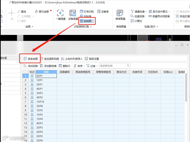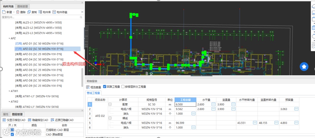 2、应急照明多存在跨层回路,双击构件列表可查看回路走向及工程量。
