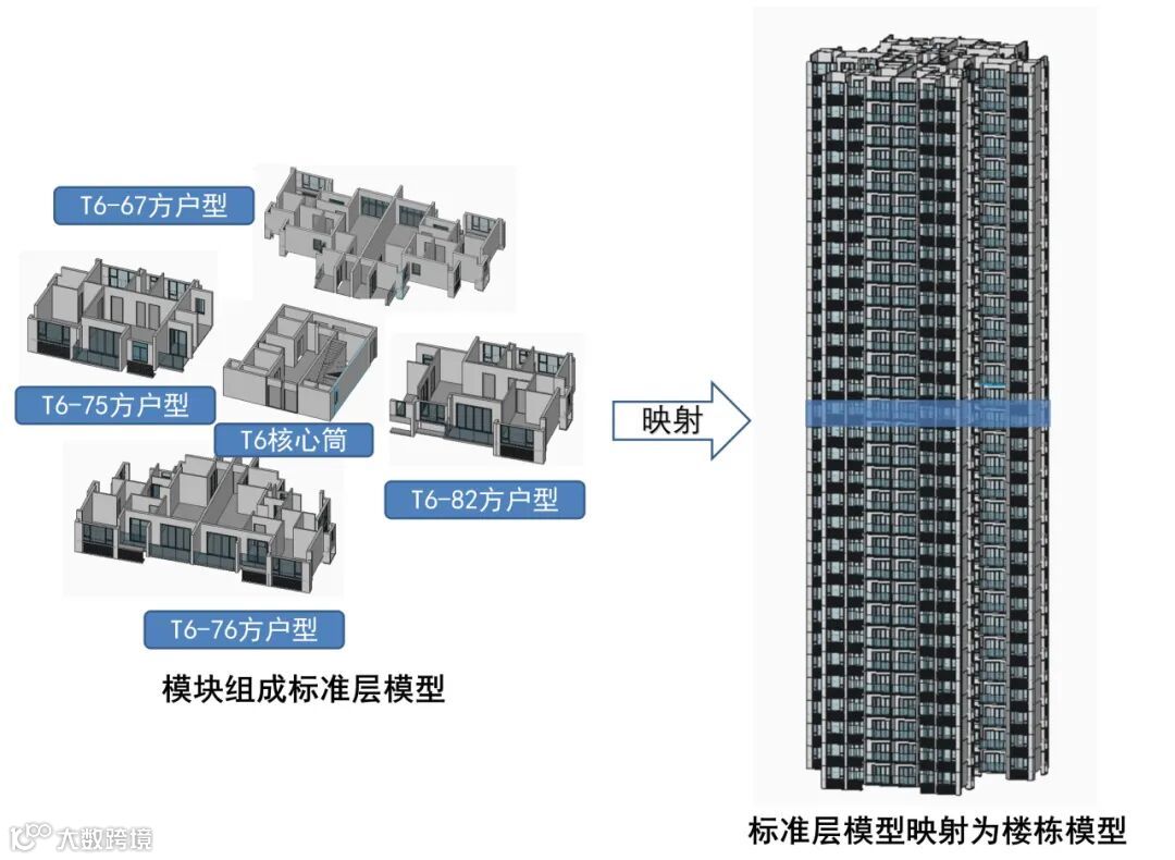 项目由5个户型模块,1个核心筒模块组合成6栋塔楼标准层,借助数维设计软件模块化,标准层映射功能,快速构建楼栋模型。相比同类国外软件使用的链接模型方式,效率更佳,性能更优。