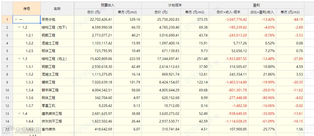 3、刷新进度工程量的成本与原目标成本对比,看看利润情况,如果总体下降了就分析各项的盈亏情况。