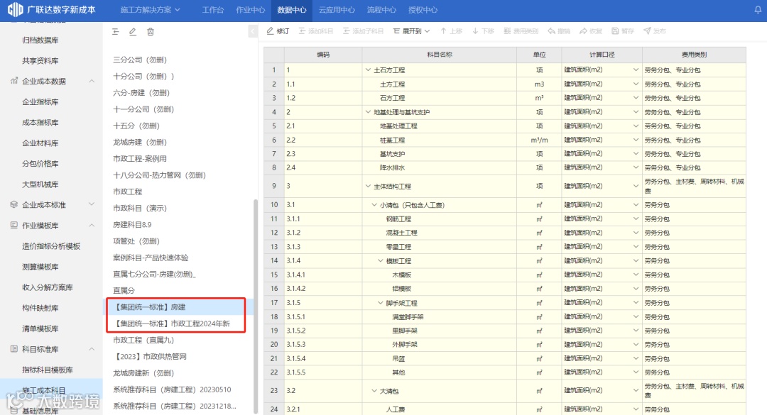 1、数据中心负责人建立保障房和市政专业的科目标准;