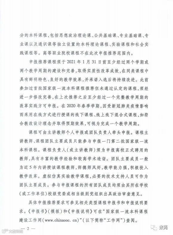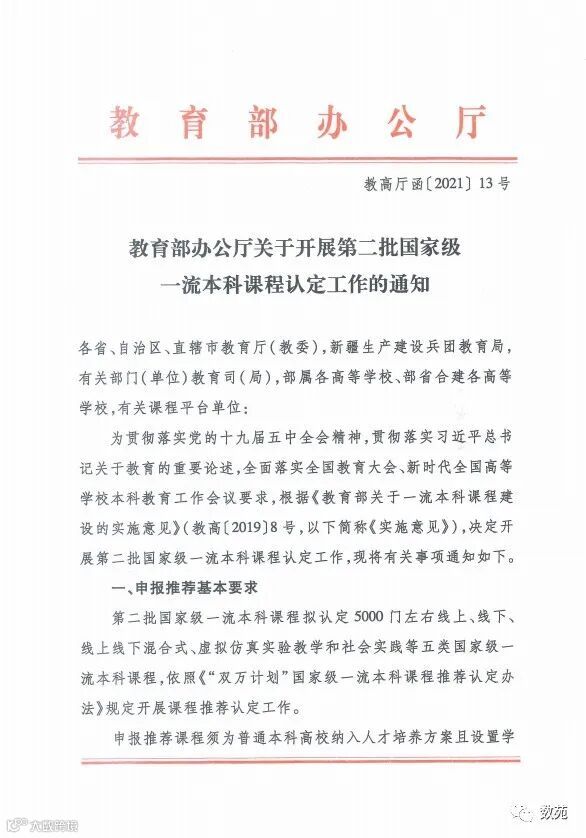 时隔一年有余,教育部办公厅于近日发布了第二批国家级一流本科课程申报通知(教高厅函〔2021〕13号),详情如下(后附申报说明及格式下载):