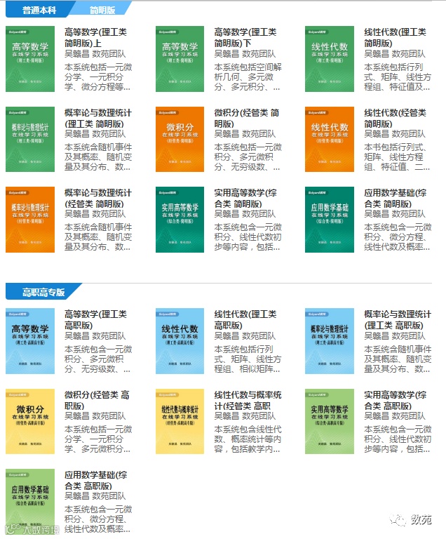 大学数学《在线学习系统》是涵盖高等院校各层次公共数学基础课程教学要求的在线学习软件。轻松备考,远离挂科!让您不仅“知其然”,而且“知其所以然”。系统不仅支持用户在PC端使用,而且支持用户通过手机APP、微信等移动方式使用。