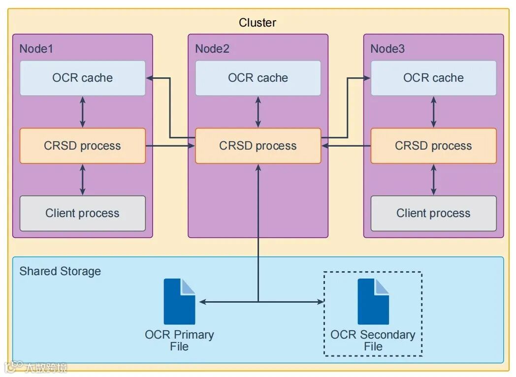 OCR是存放在共享存储中的,所以在整个集群中每个节点都通过本地的CRSD进程去访问OCR缓存在其内存中维护着的一个副本。同时为了保证OCR的完整性,Oracle不允许所有节点都能直接操作OCR,只有一个进程可以对OCR进行修改,这个进程被称为OCR Master。这个进程负责刷新自己本地的OCR cache以及集群中其他节点的OCR cache。换个方式说,每个节点的OCR客户端查询的都是本地的OCR缓存,当这个节点需要对OCR进行一些修改的时候他们将通过本地的CRSD进程与OCR Master进程进行交互来实现自己的修改。