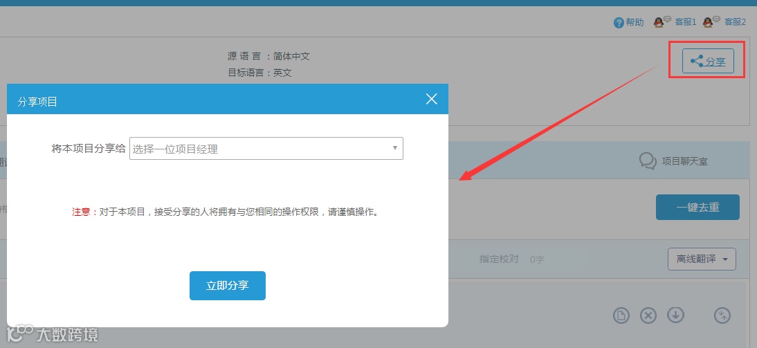 PM临时有事要请假?项目可以分享给其他PM;翻译公司有专门的人负责去重等译前处理?可由译前处理人创建项目、上传文件并进行预处理,再将项目分享给PM,由PM完成派稿等后续项目管理工作。