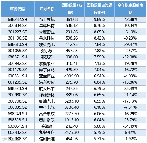 4月以来,共计397家上市公司实施回购。下表列示出回购数量占流通股份比例最高的前20家公司。