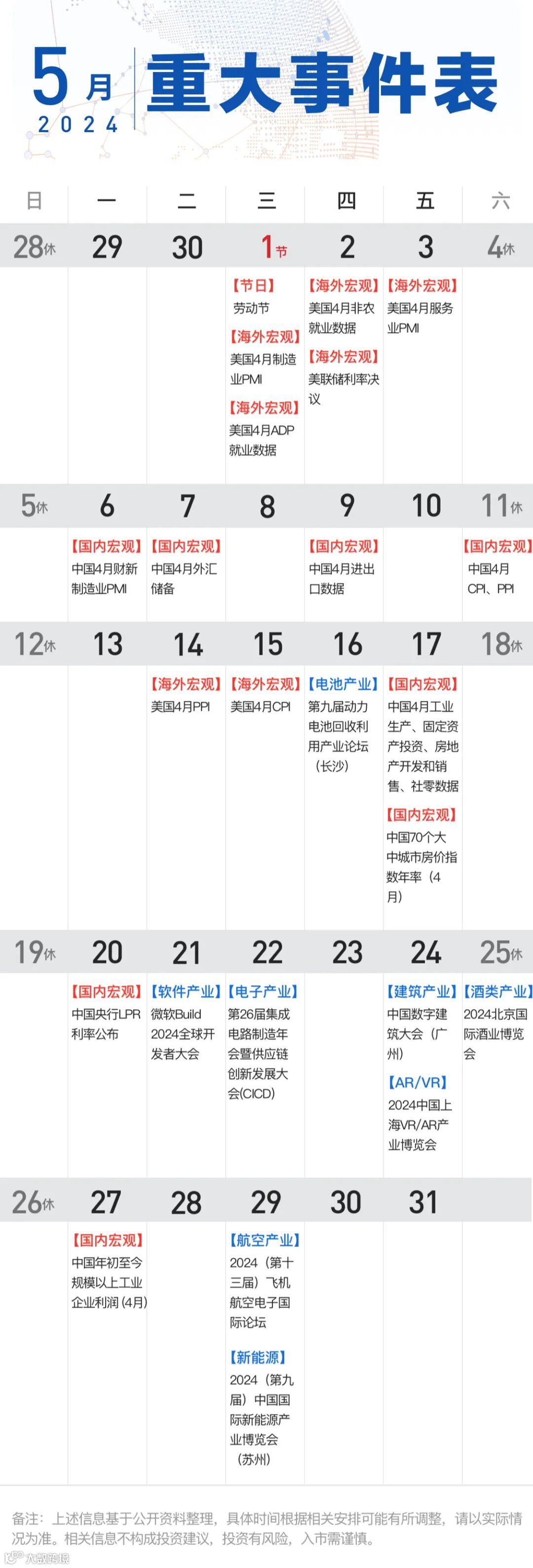 5月除了国内外常规的经济数据,各产业大会也密集召开,建议重点关注各行业发布的最新前瞻热点。