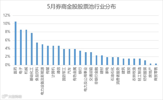 5月券商金股名单中去重后合计为257只。以中信一级行业的权重分布分析,本月券商金股在医药(10.51%)、电子(8.56%)、机械(8.56%)、基础化工(7.78%)和食品饮料(5.45%)行业配置较高。