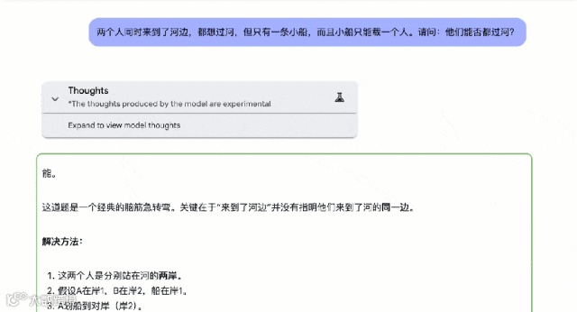 Gemini 2.5 Pro用时约11秒便成功识破了逻辑陷阱:“两个人同时来到了河边”不一定都在同岸,如果是对岸就成立了。