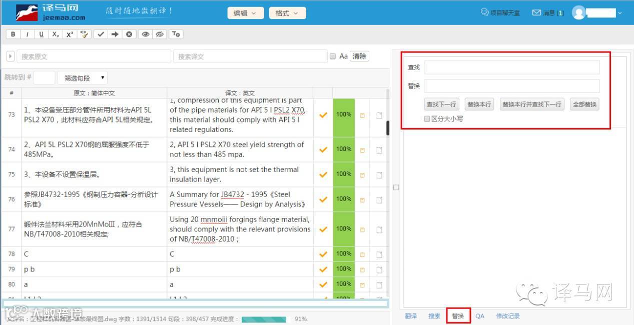 3、 新增译文查找替换功能,可对译文逐行替换和批量替换